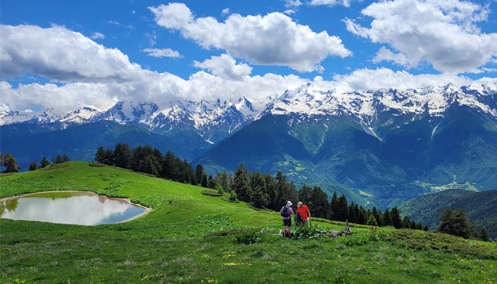 The hike begins along the serene Adischishkhali River, gradually ascending to the Chkutnieri Pass (2,750 m) in about two hours. From the pass, enjoy breathtaking views of surrounding peaks and expansive high valleys, a true feast for nature lovers and photographers.