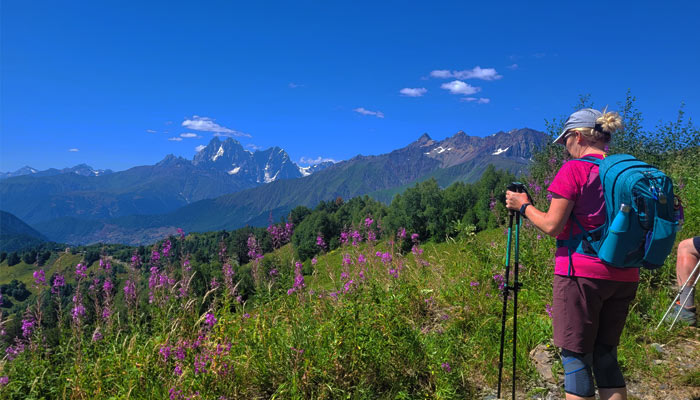 The hike begins gently, with around 5 kilometers across lush, flower-filled meadows, offering splendid views of the surrounding glaciers. A more demanding ascent of about 500 meters follows, rewarding you with a breathtaking panorama of the majestic Tetnuldi Mountain (4,858 m).